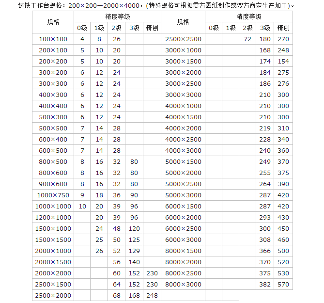 鑄鐵工作臺(tái)精度:按國家標(biāo)準(zhǔn)計(jì)量檢定規(guī)程執(zhí)行,分別為00、0、1、2、3和精刨六個(gè)等級(jí)。